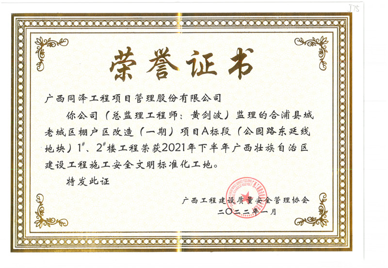 合浦縣城老城區棚戶區改造(一期)項目A標段項目榮獲2021年(下半年)廣西壯族自治區建設工程施工安全文明標準化工地